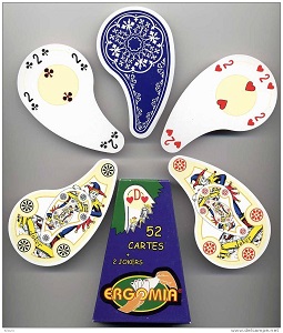 Un jeu de cartes primé au Concours Lépine, révolutionnaire dans sa forme (700 ans que le jeu de cartes était rectangulaire) qui a surpris, étonné, dérouté et surtout valorisé par des personnes qui voyaient l’intérêt de ce jeu en forme ergonomique pour tous ceux qui ont du mal à tenir beaucoup de cartes en main